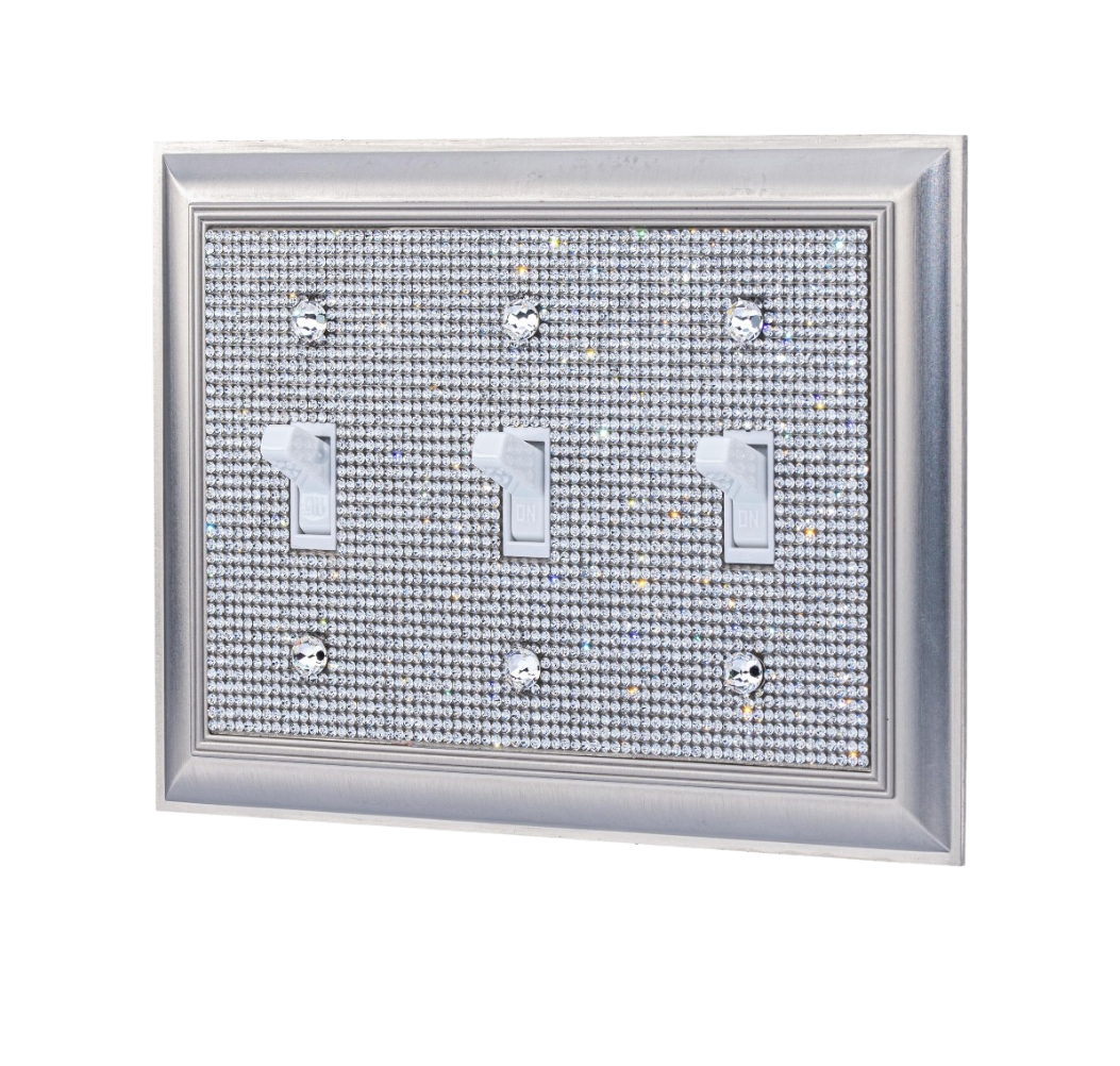 Add amazing sparkle & shine to any room with this handcrafted, rhinestone covered, satin nickel finish, beveled wall switch plate. The craftsmanship and attention to detail make these light switch plates truly a piece of art that would add a special touch to any room.
