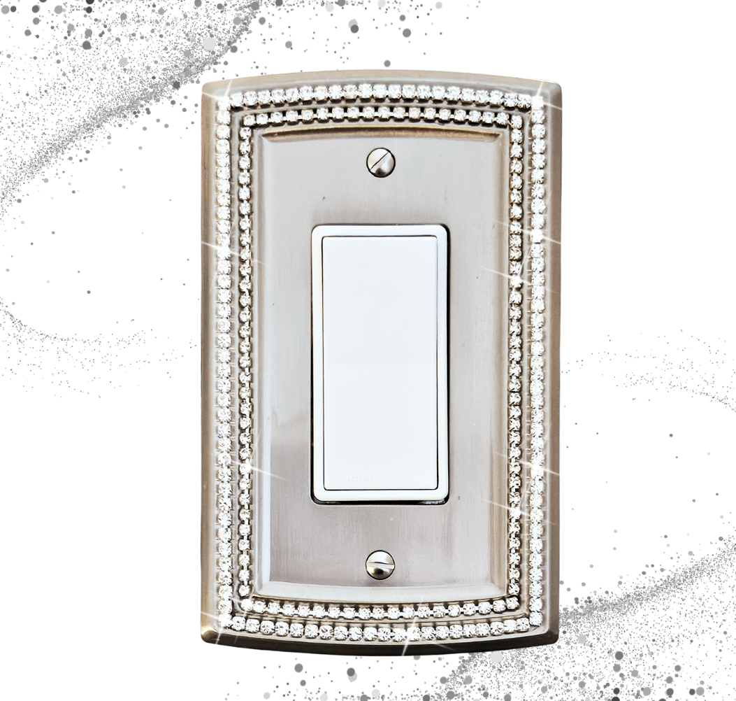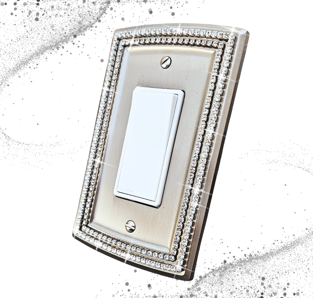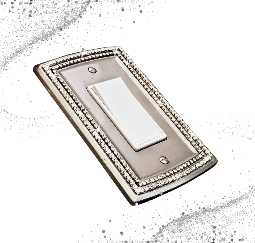 Add amazing sparkle & shine to any room with this handcrafted, rhinestone covered, satin nickel finish, beveled wall switch plate. The craftsmanship and attention to detail make these light switch plates truly a piece of art that would add a special touch to any room.